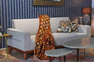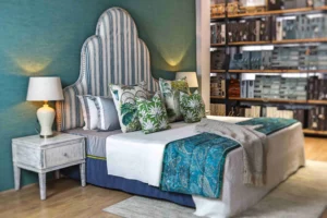 Fab Crafts’ showroom is a haven for textile enthusiasts, showcasing an exquisite range of fabrics for curtains, cushions, upholstery, and more. Their comprehensive selection caters to every design aesthetic. Jaipur Woods’ furniture complements this curated collection, elegantly displaying the luxurious fabrics and highlighting their smart, contemporary designs.