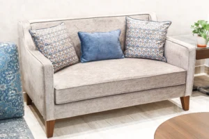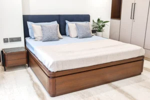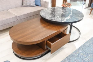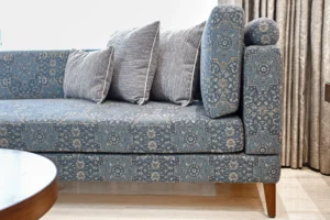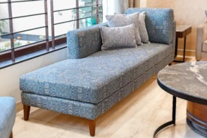 Designed by Ar. Sheetal Tater of Navya Designs, this home is a testament to peaceful, energetic living. Jaipur woods design philosophy centers on capturing the essence of a space by employing minimalist geometric forms. The sofas feature clean lines and a classic silhouette, while the chaise adds a touch of elegance with its patterned upholstery and rolled armrest. The throw pillows introduce varied textures and patterns, adding visual interest while maintaining the room’s cohesive color scheme. The cylindrical coffee table with a stone top and open metal base serves as a modern focal point, contrasting slightly with the more traditional upholstery pieces.