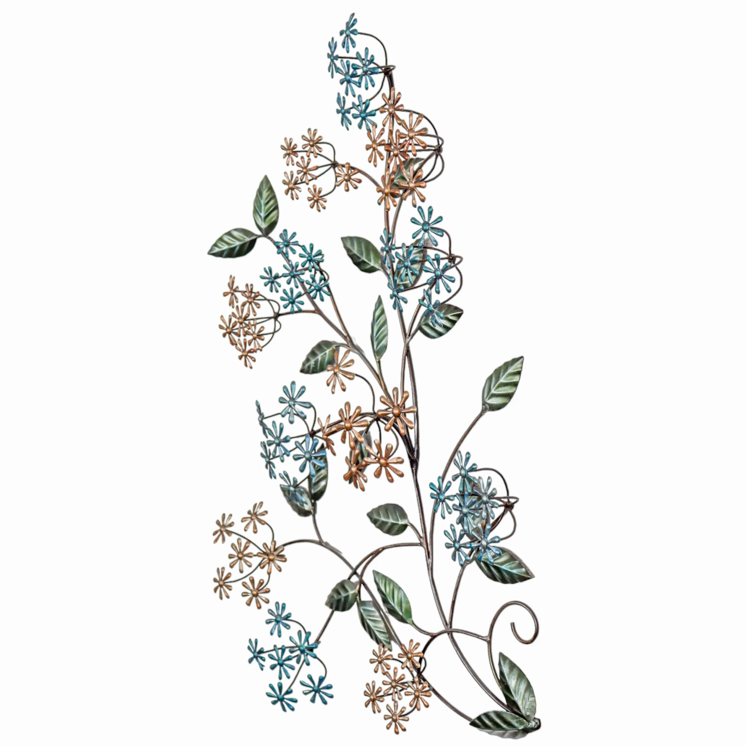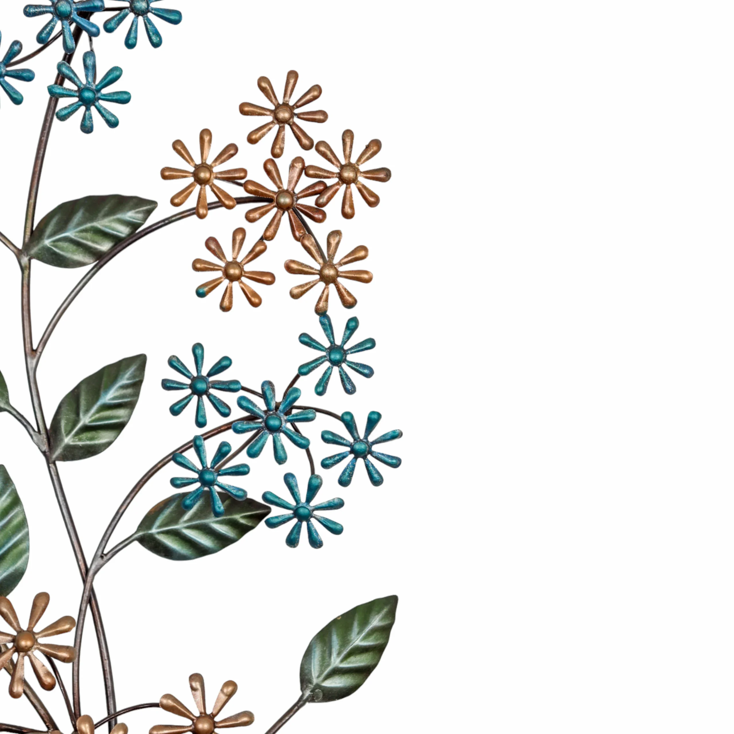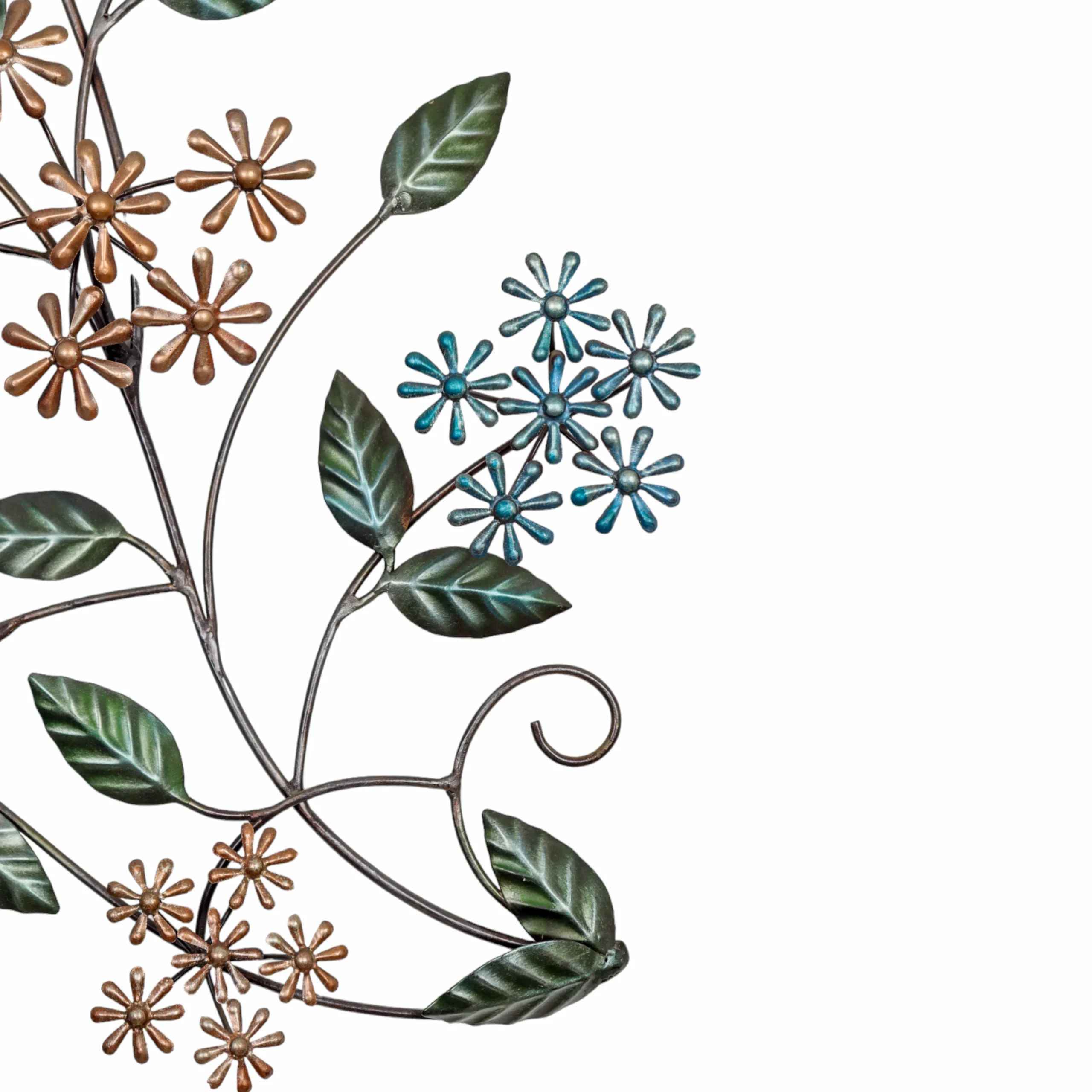 Metal wall art features a beautifully crafted design of flowers and leaves, adding a touch of elegance to any space. The intricate detailing and vibrant finish create a stunning focal point