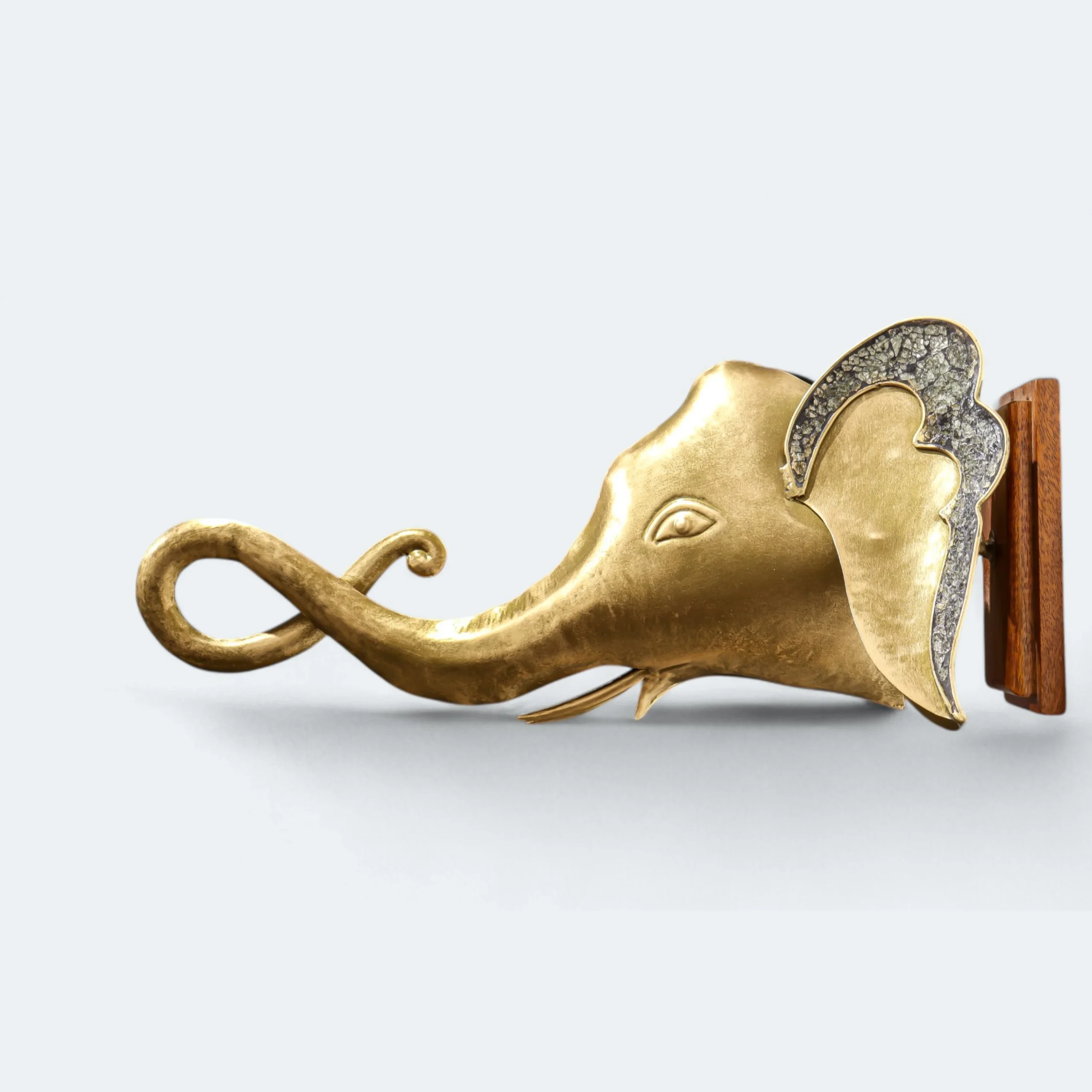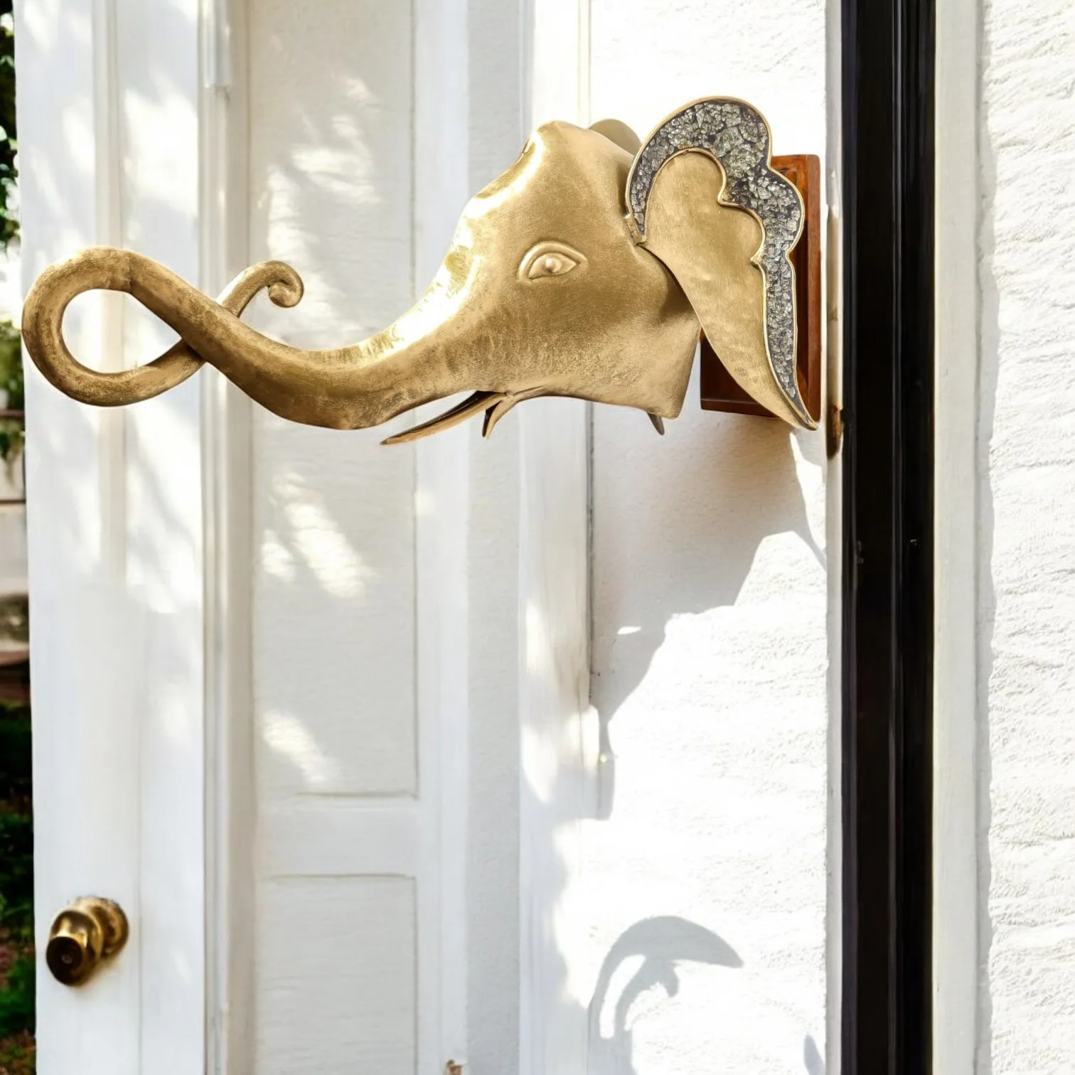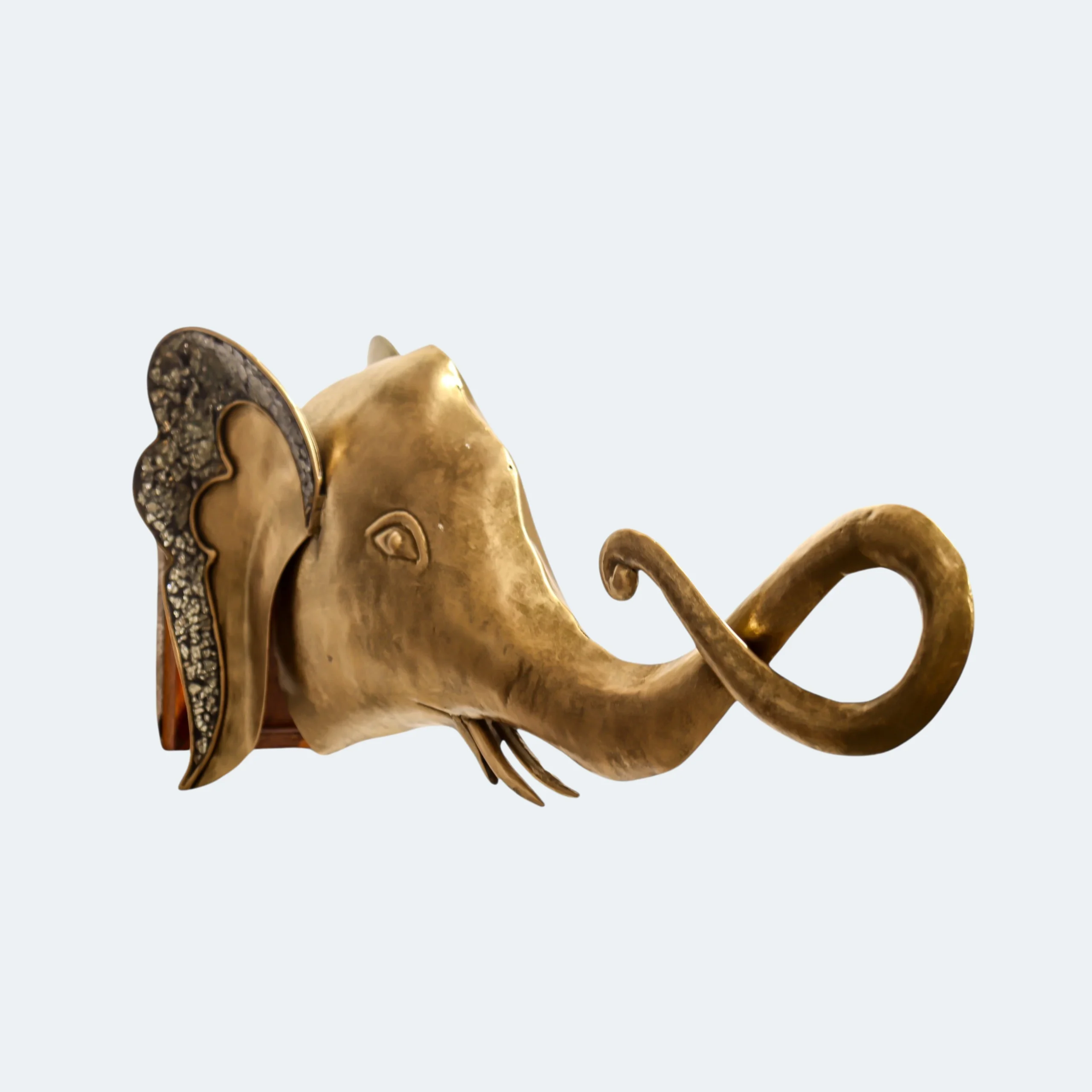This exquisite gold elephant head wall decor combines elegance and artistry, featuring a stunning metallic finish that captures attention. The intricate design is complemented by a sturdy wooden handle, making it not only a striking decorative piece but also a functional addition to your home. Ideal for enhancing any interior space, this metal elephant head serves as a symbol of strength and wisdom, perfect for those who appreciate unique and meaningful decor.
