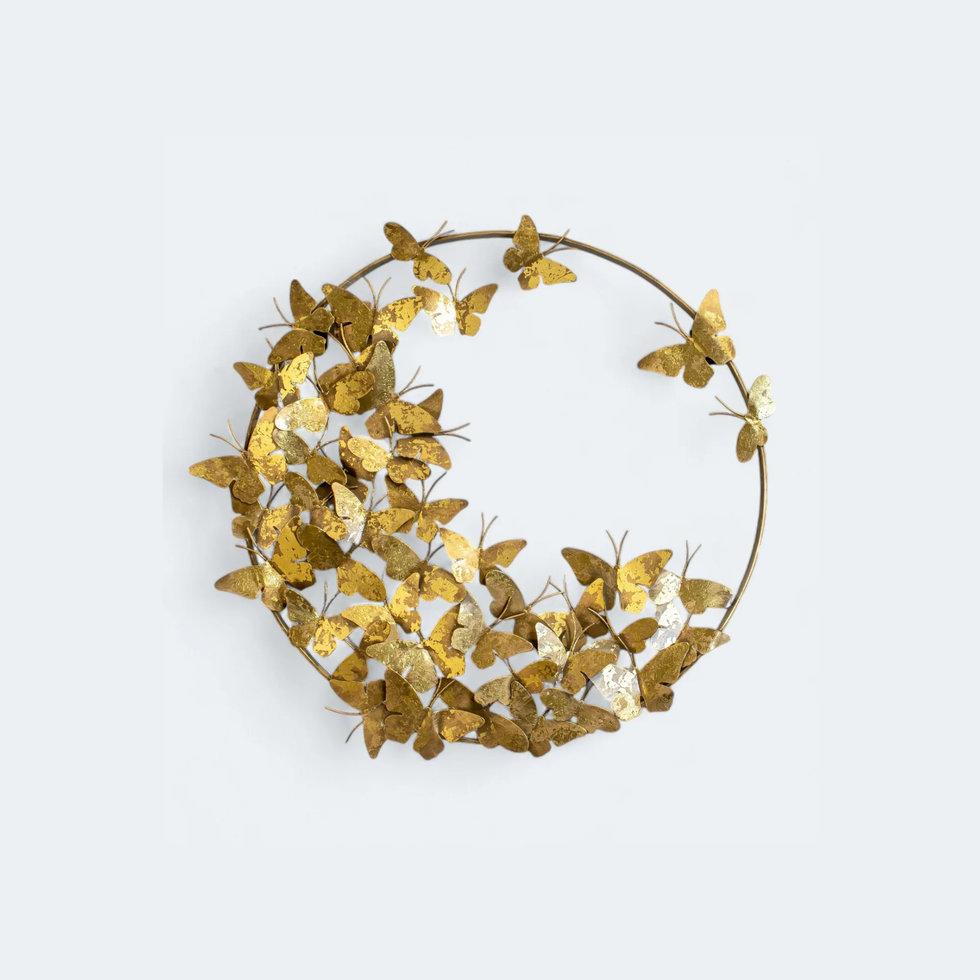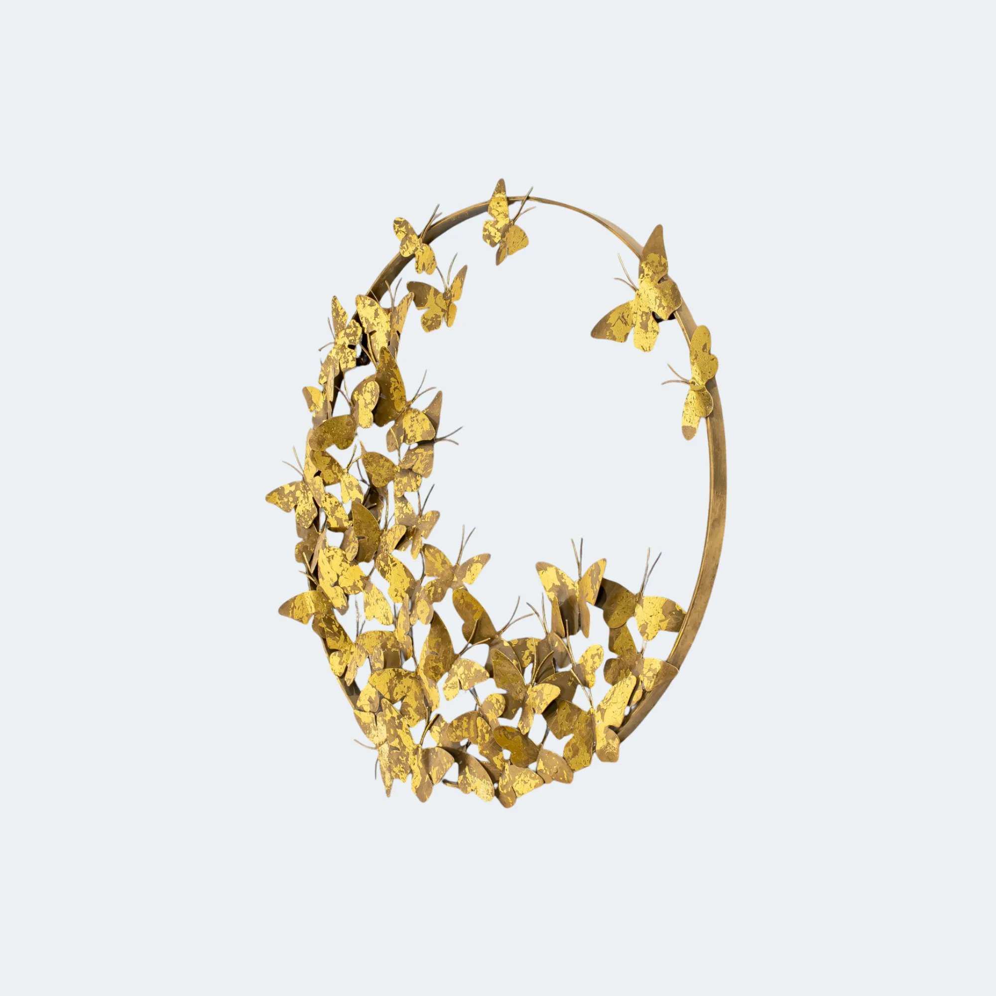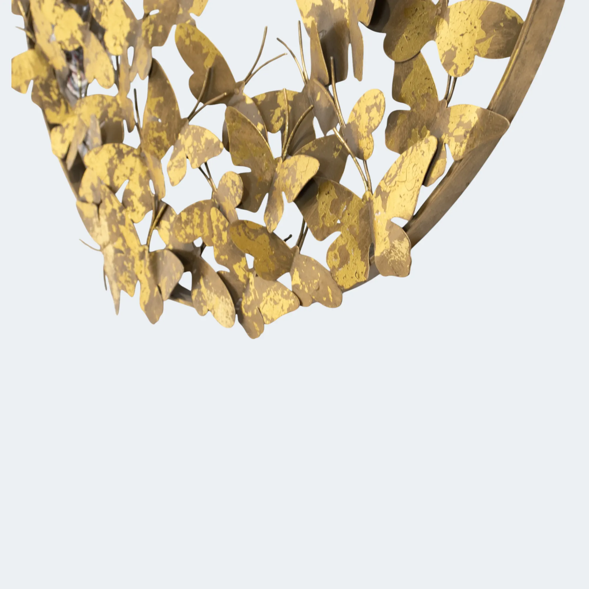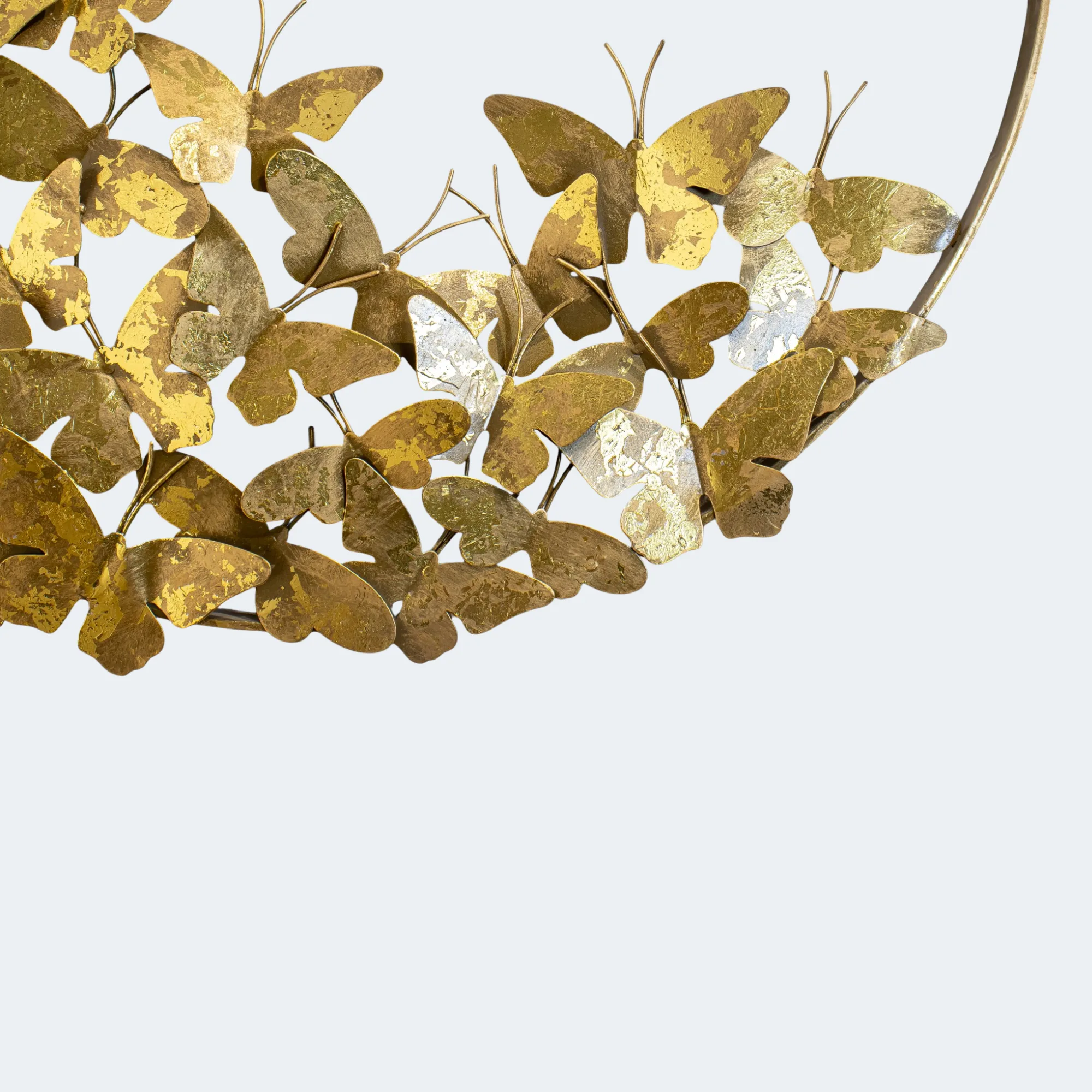 Our enchanting wall art captures the ethereal beauty of a swarm of butterflies in flight. Crafted from metal with intricate details, the piece features a cluster of delicate butterflies arranged in a circular formation