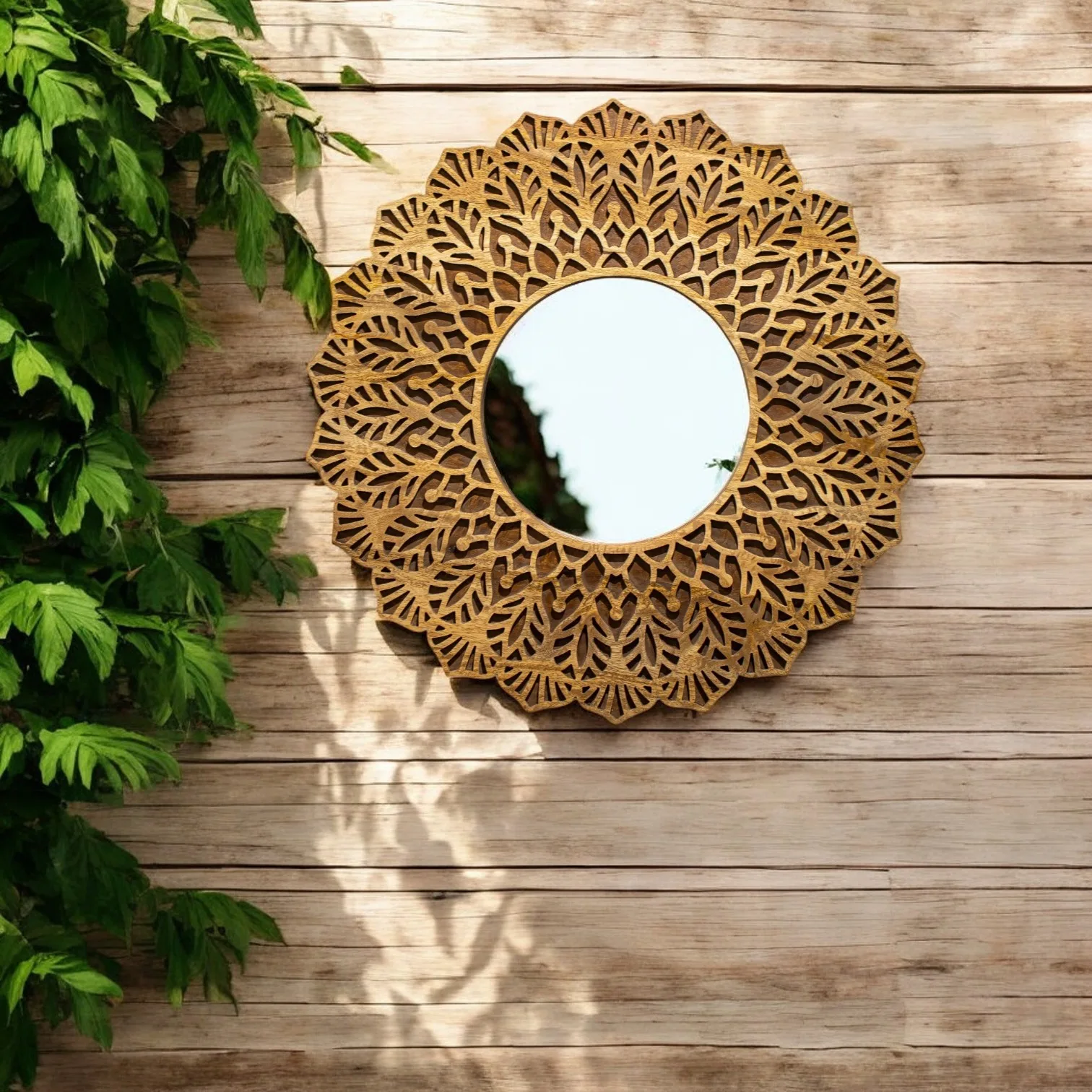 This stunning round wall mirror is a statement piece that will add a touch of global elegance to your home. The wooden frame features an intricate mandala design with hand-carved details, showcasing the beauty of traditional craftsmanship. The warm wood tone and intricate patterns create a captivating visual effect, making this mirror a perfect addition to any space with a bohemian or global-inspired aesthetic.
