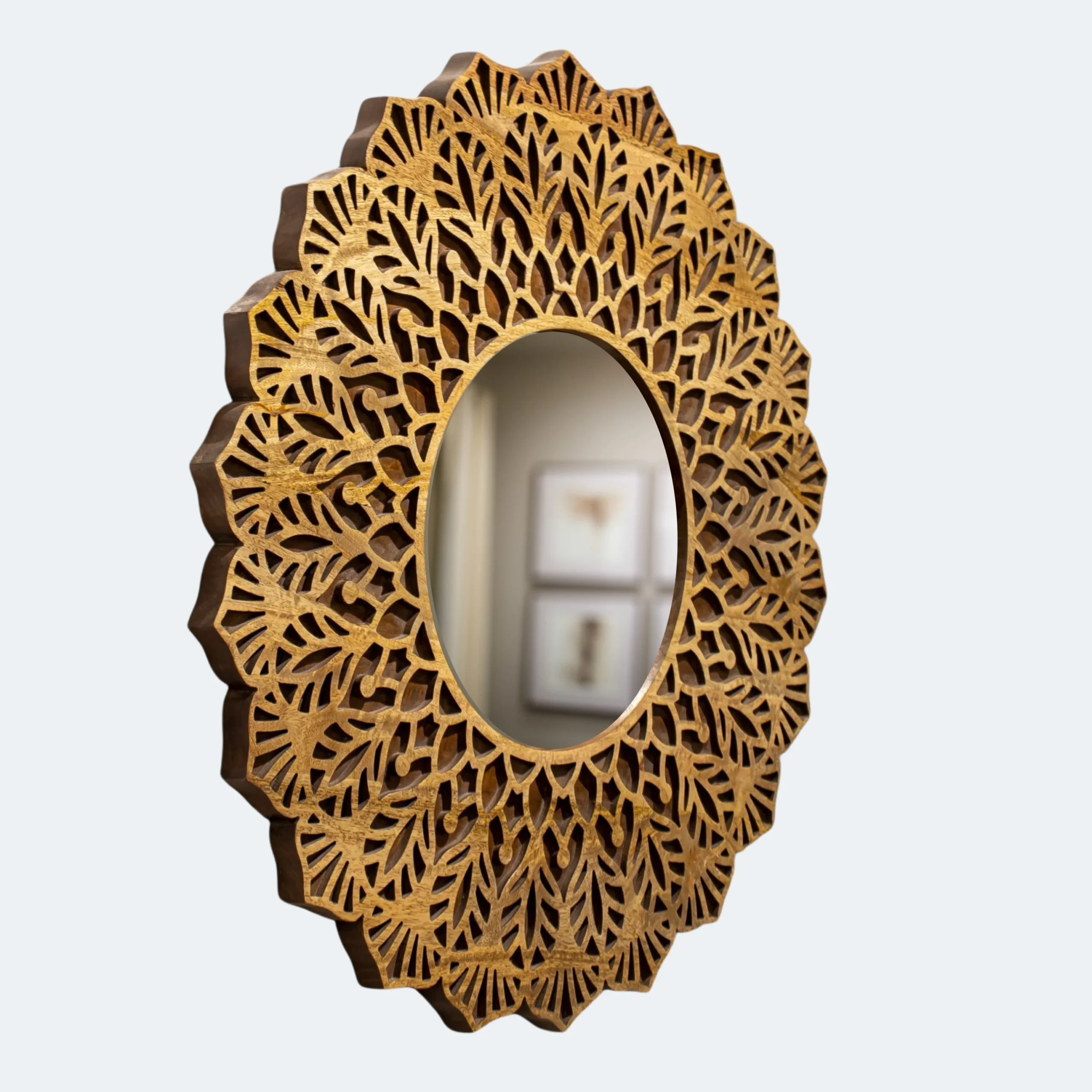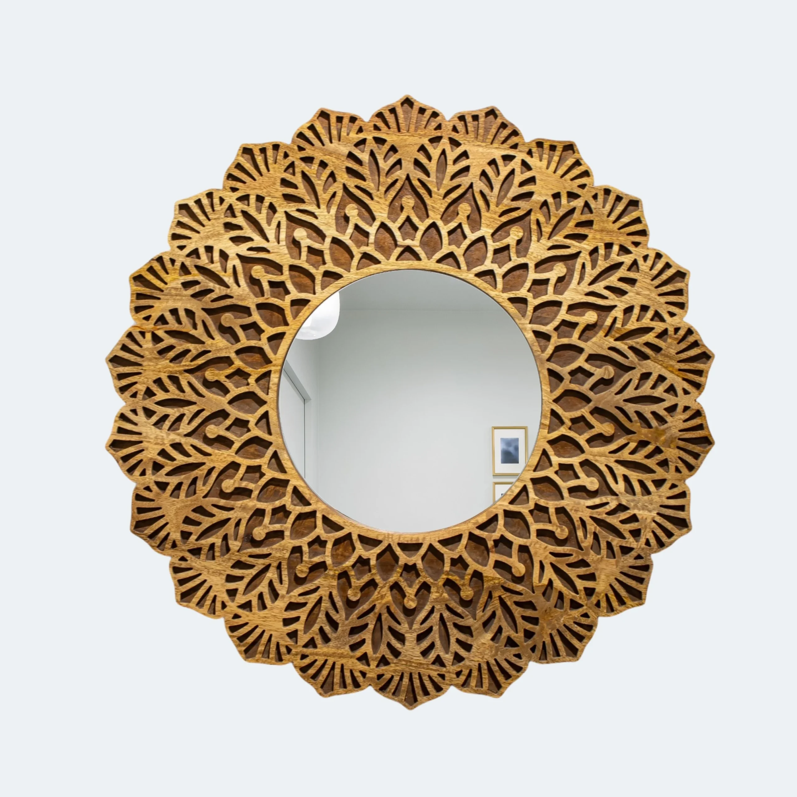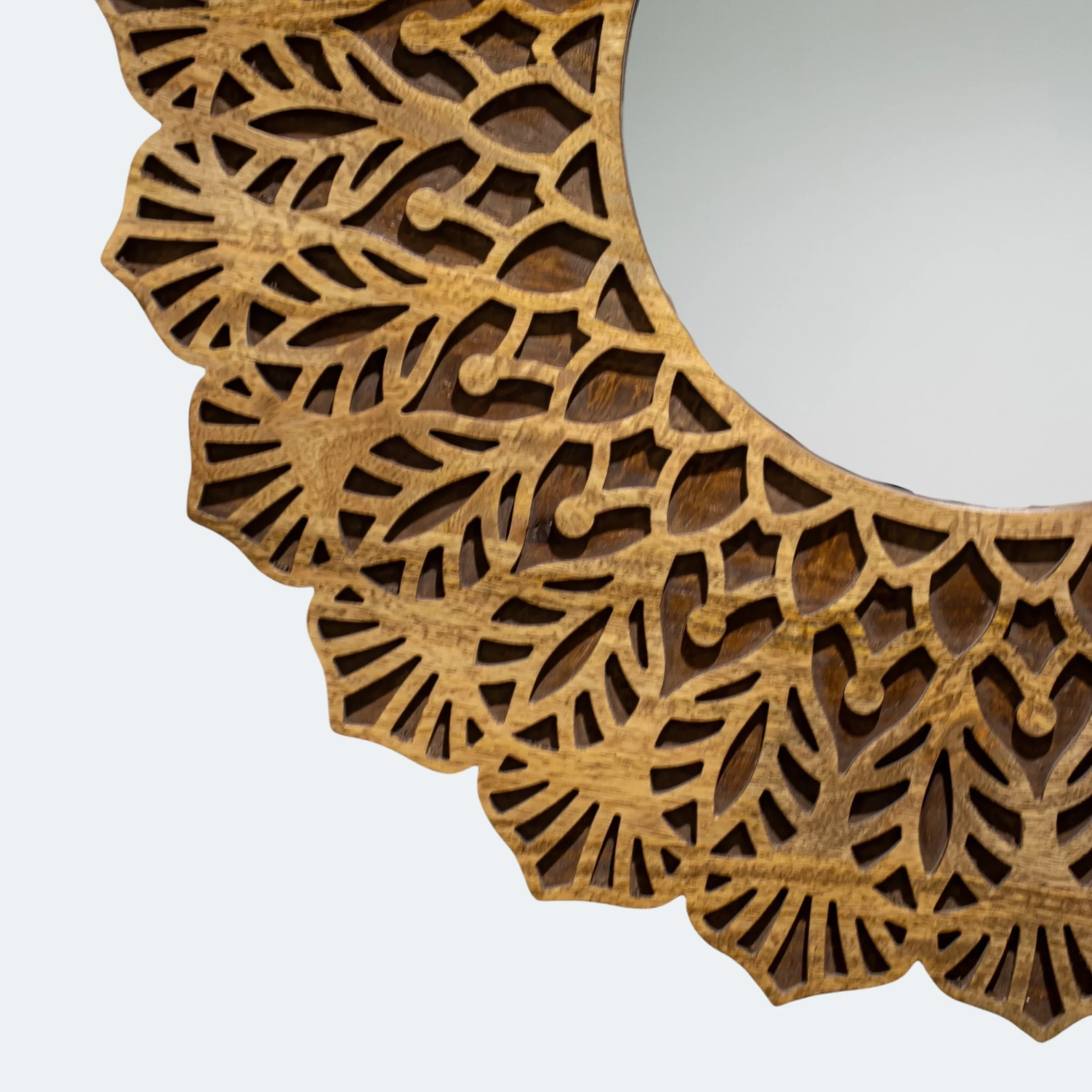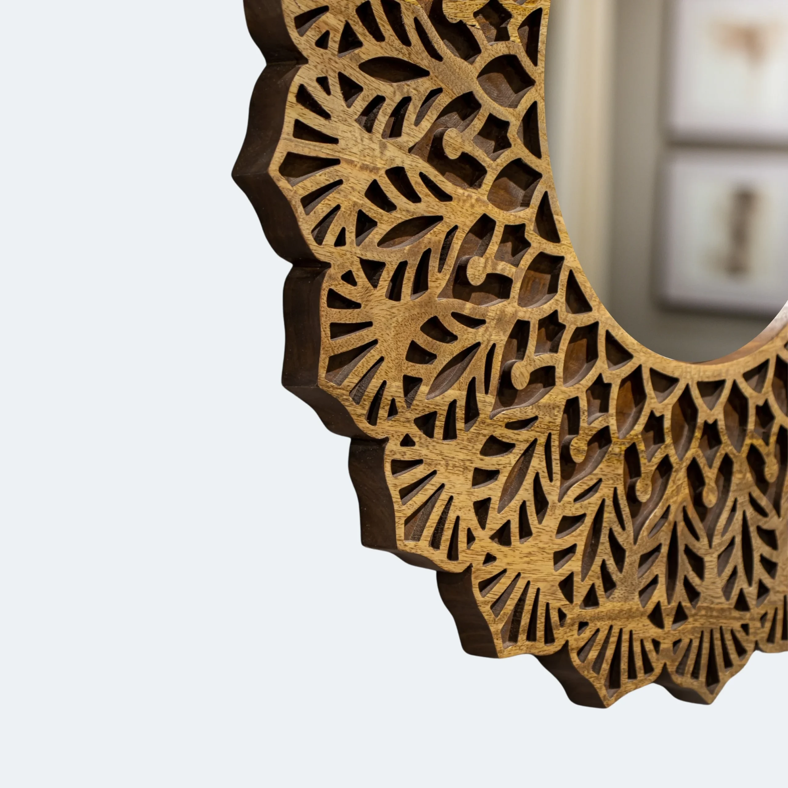 This stunning round wall mirror is a statement piece that will add a touch of global elegance to your home. The wooden frame features an intricate mandala design with hand-carved details, showcasing the beauty of traditional craftsmanship.