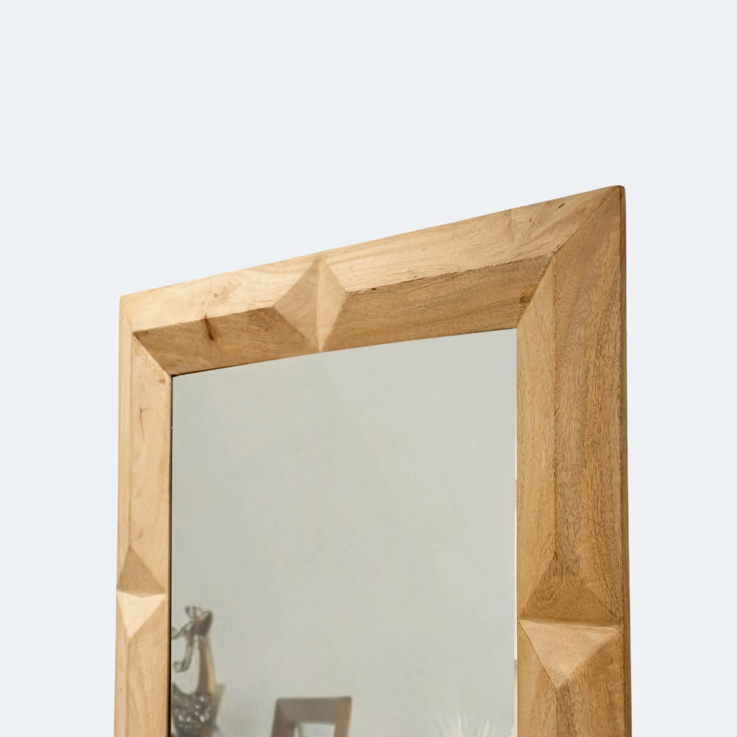 This striking rectangular wall mirror features a bold and modern design with a geometrically carved wooden frame. The clean lines and angular shapes create a contemporary aesthetic that will add a touch of sophistication to any space.