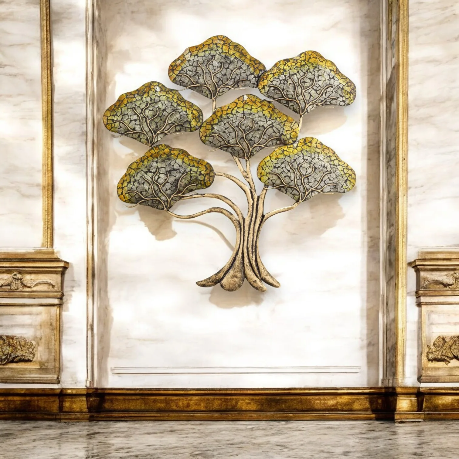 Your living space with the exquisite gold and green tree wall hanging, a stunning piece of art that combines elegance and nature. This Mirror Maze Wall Decor features a beautifully crafted metal tree design, reflecting light and adding depth to any room. Its harmonious color palette of gold and green brings a touch of sophistication, making it a perfect focal point for your home or office decor.