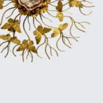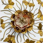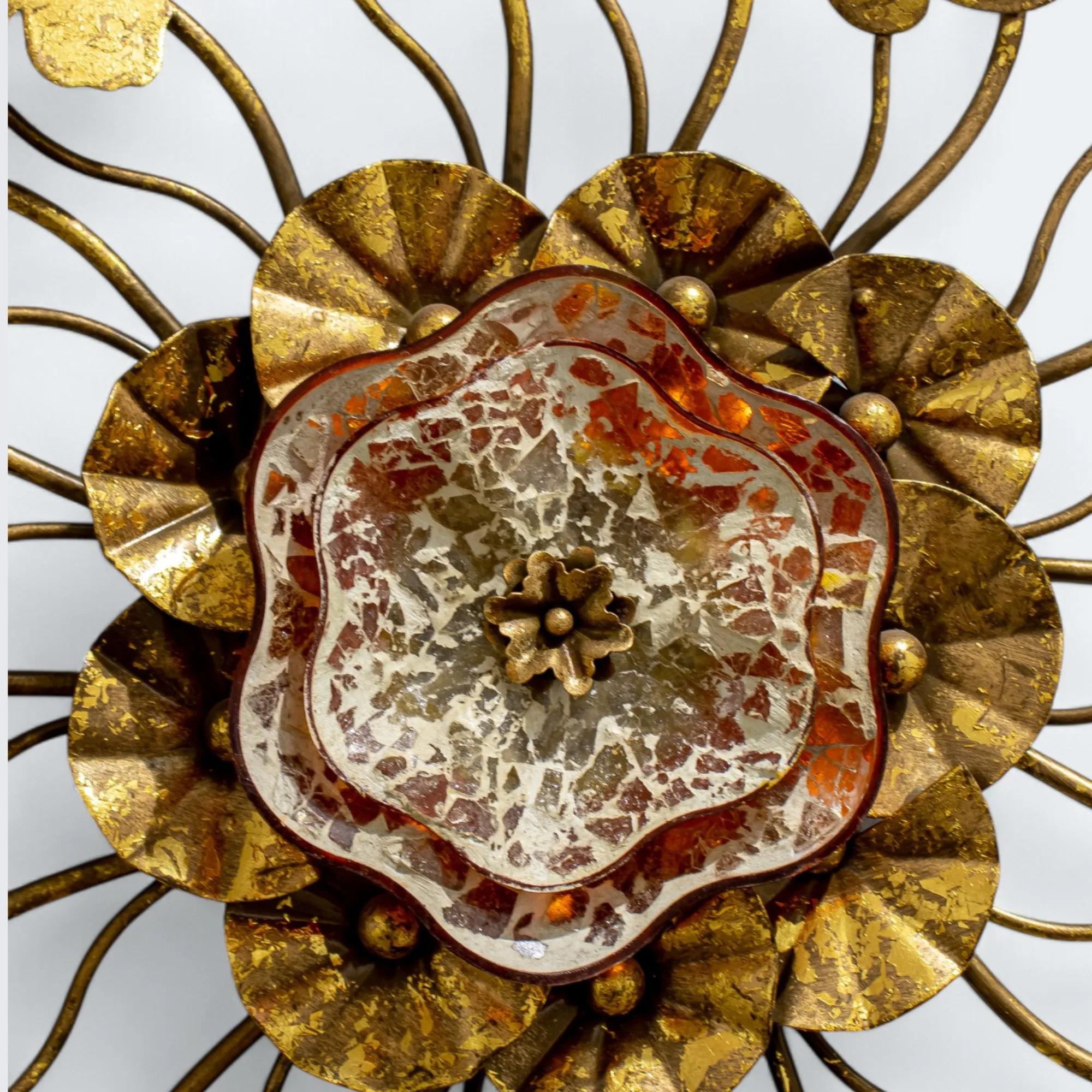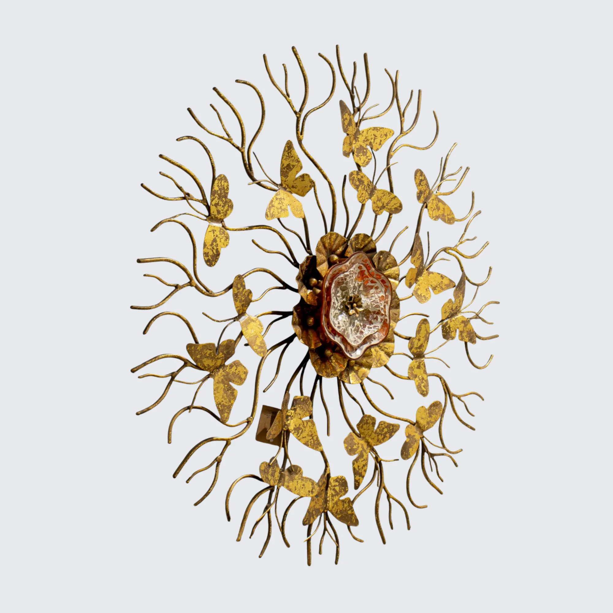 This captivating wall art evokes the beauty of a sunburst with a whimsical twist. Crafted from metal with intricate details, the piece features a central floral motif surrounded by delicate butterflies and swirling branches, creating a sense of movement and energy. The warm gold finish adds a touch of elegance and sophistication, making it a perfect addition to any space with contemporary or nature-inspired decor. This unique and eye-catching wall hanging is sure to inspire awe and add a touch of magic to your home.