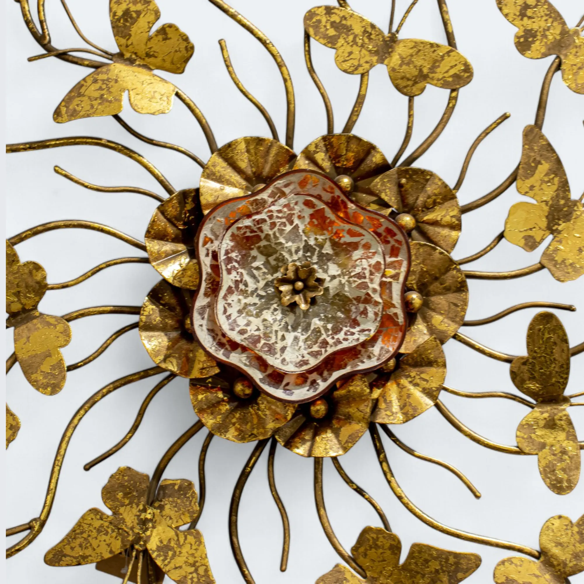 This captivating wall art evokes the beauty of a sunburst with a whimsical twist. Crafted from metal with intricate details, the piece features a central floral motif surrounded by delicate butterflies and swirling branches.