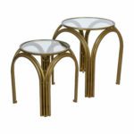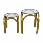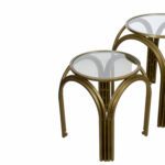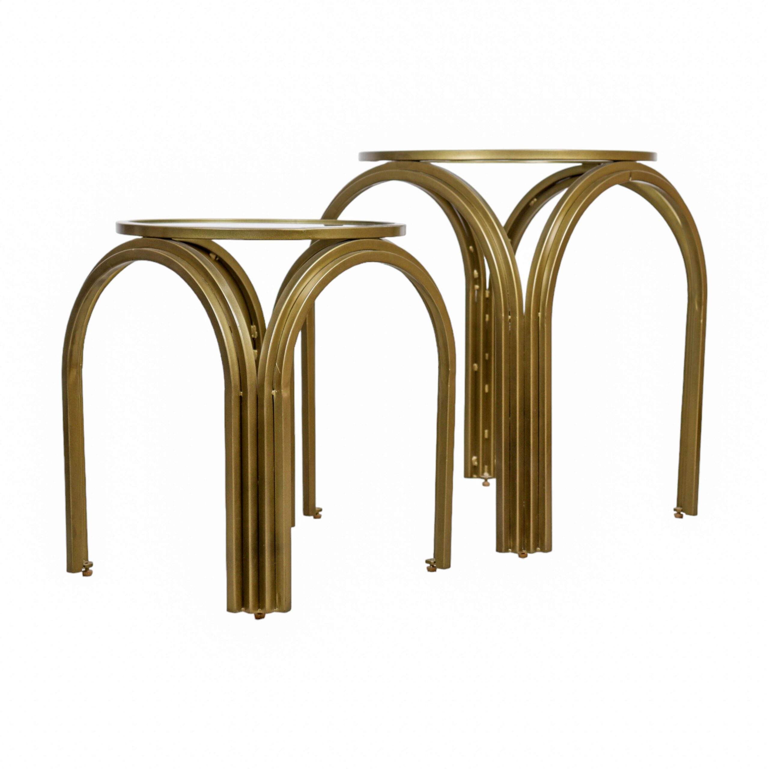 Elevate your living space with the exquisite Brass Arch Nesting Tables, a stunning duo that seamlessly combines elegance and functionality. Crafted from high-quality gold metal