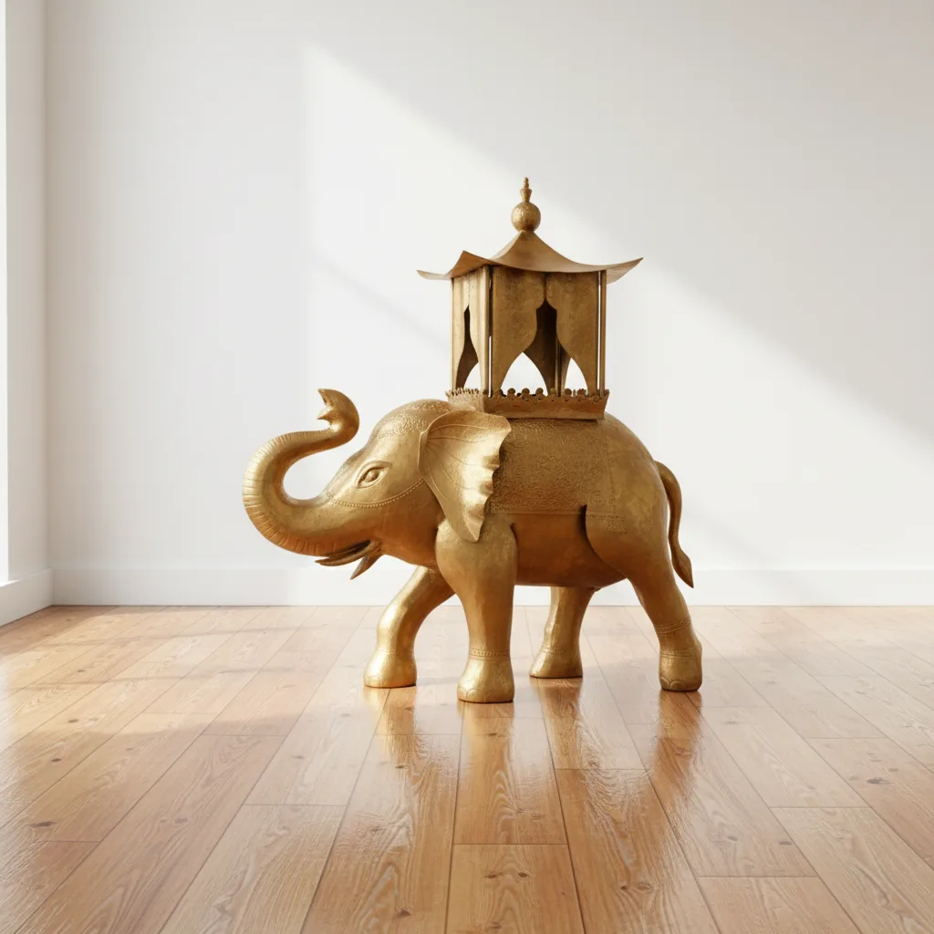 This exquisite golden elephant statue, adorned with a beautifully crafted roof, serves as a stunning decorative piece for any space. The intricate detailing and lustrous finish of the figurine highlight the elegance and cultural significance of the elephant, symbolizing wisdom and strength. Perfect for enhancing your home or office decor, this unique item is sure to captivate attention and inspire admiration.