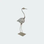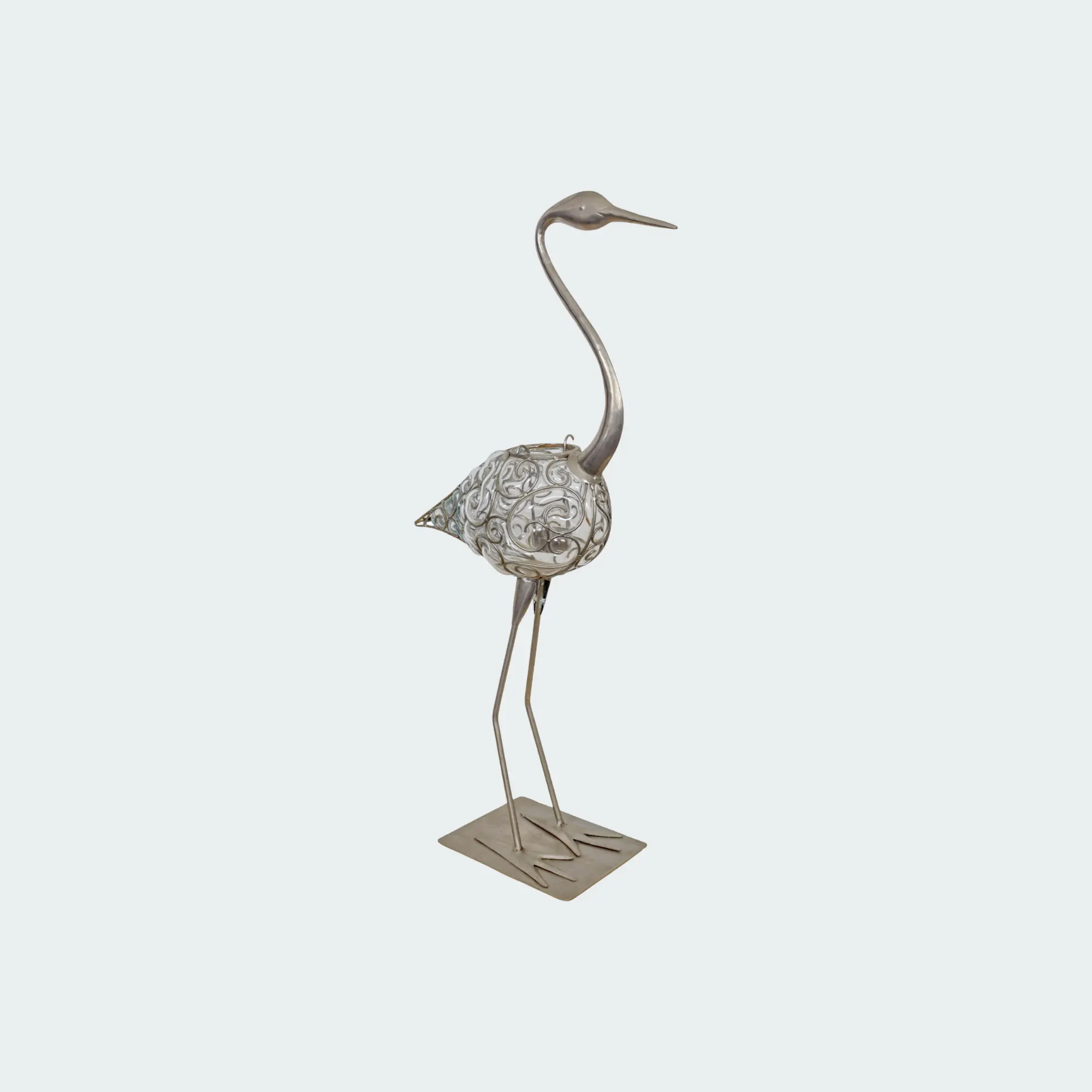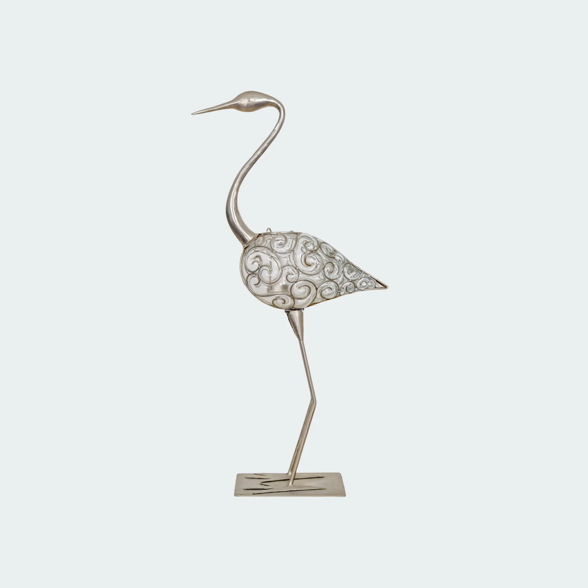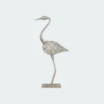 Elevate your home decor with the exquisite Great Egret Bird Votive, a stunning silver metal statue that captures the elegance and grace of this majestic bird.